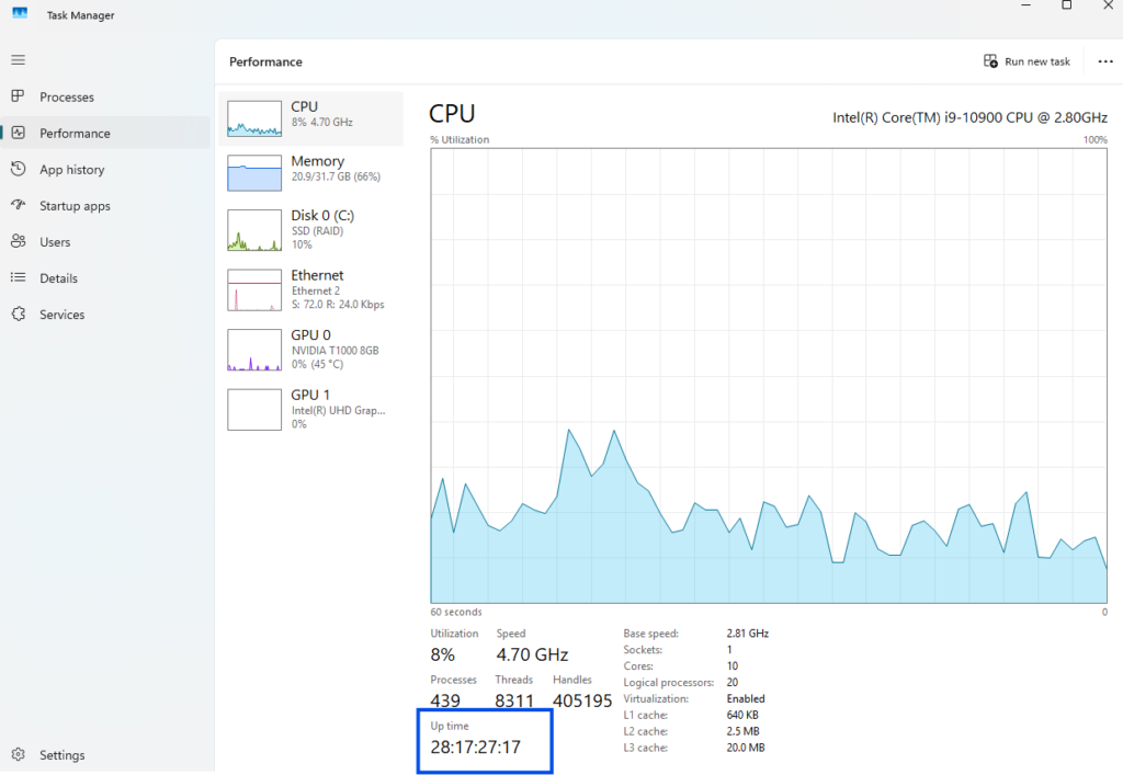 If you’re not sure how long your computer has been running, you can check it easily. Open Task Manager (press Ctrl + Alt + Delete), go to the Performance tab -> CPU, and look at the Uptime at the bottom.
